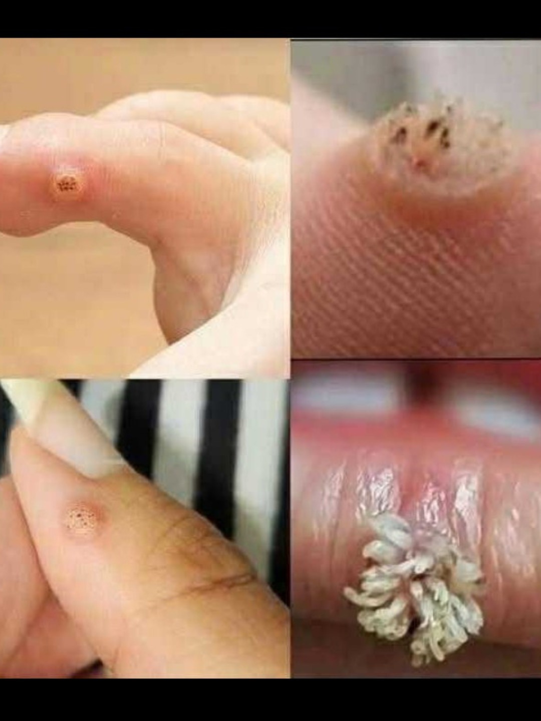 Małe czarne kropki widoczne wewnątrz wielu brodawek to zatkane naczynia krwionośne, a nie nasiona czy korzenie — ale potwierdzają obecność aktywnej infekcji wirusowej pod skórą.