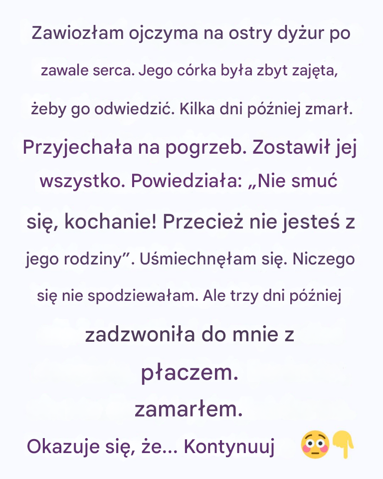 Przez trzy dni czuwałam przy łóżku Henry'ego, trzymając go za rękę, rozmawiając z nim, nawet gdy nie mógł odpowiedzieć. Mówiłam mu, że nie jest sam. Mówiłam mu, że go kocham. A kiedy wydał ostatnie tchnienie, to ja poczułam, jak jego palce znieruchomiały.